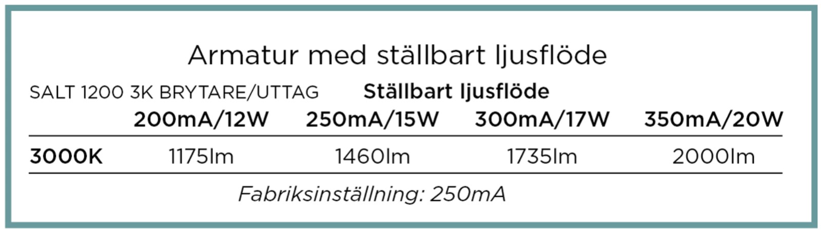 Salt är en montagevänlig underskåpsarmatur för montering under överskåp, hyllor etc med en strömbrytare tänd/släck och ett jordat uttag 220V. Uttag och belysning kan styras var för sig. Armaturen har ställbart ljusflöde i fyra lägen. Stomme av vitlackerad stålplåt. Bländskydd av opal akryl. Monteras under överskåp och hyllor. Kabelinföring från ovansida samt via 1st knock-out hål i gavel eller 1 st knock-out på vardera långsida. Insticksplint 4x2,5 mm². Salt har ställbart ljusflöde via dip-switchar direkt på drivdonet, se lumentabell under bilden eller längre ned på produktsidan alt. montageanvisning. Hörnfäste E70 290 82 finns som tillbehör, beställs separat.