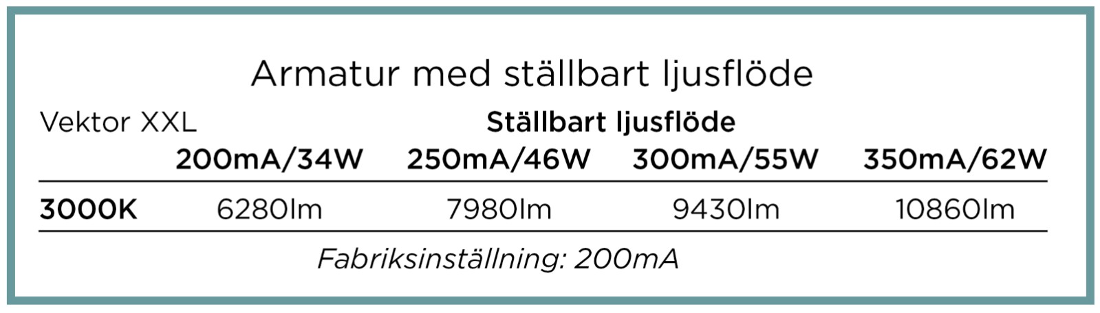 Vektor är en allmänljusarmatur IP44, utformad för att ge lägre miljöpåverkan både genom sin konstruktion och sitt emballage. Armaturen är till över 98 % återvinningsbar. Vektor har ställbart ljusflöde i fyra lägen. Stomme av återvunnen vitlackerad aluminium (85%) för bra kylning av LED och elektronik, gavlar av vit biobaserad plast, kupa av återvunnen frostad linjeprismatisk akryl = 20%. Monteras dikt tak, lina, på vägg eller konsol. Möjlighet till dos-montage, enligt borranvisning. Armaturen är D-märkt. Kabelinföring Ø 20 mm i vardera gavel samt 2 st Ø 20 mm kabelinföring på ovansidan. Insticksplint i mitten av armaturen 5x2x2,5 mm². Vektor har ställbart ljusflöde via dip-switchar direkt på drivdonet, se lumentabell under bilden eller längre ned på produktsidan alt. montageanvisning.