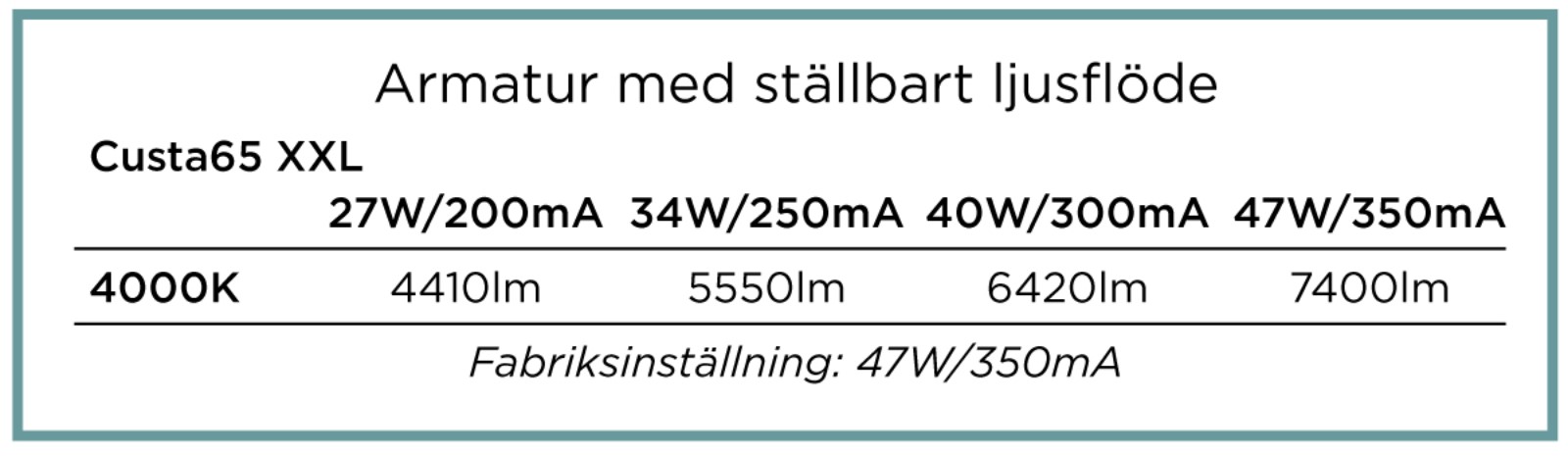Denna Custa65 har ställbart ljusflöde i fyra lägen på drivdonet och en armatur för användning i tuffa miljöer. Se lumentabell under bilder eller längre ned på produktsidan alt. montageanvisning. Stomme av polykarbonat och kupa av polykarbonat. Samtliga komponenter är monterade på en fäll- och löstagbar lackerad insatsplåt. Clips och kuplås av rostfritt stål. IK-Klass: IK10. Armaturen är D-märkt. Monteras dikt tak, på vägg eller lina. Linfästen som är justerbara längsled medlevereras. Godkänd omgivningstemperatur -25°C till +45°C. För aktuell livslängd LED-modul (L80) vid olika temperaturer, se diagram. Kabelinföring PG13,5 för kabel upp till 12 mm i vardera gavel. Insticksplint i vardera gavel 5x2x2,5 mm². Överkoppplad.