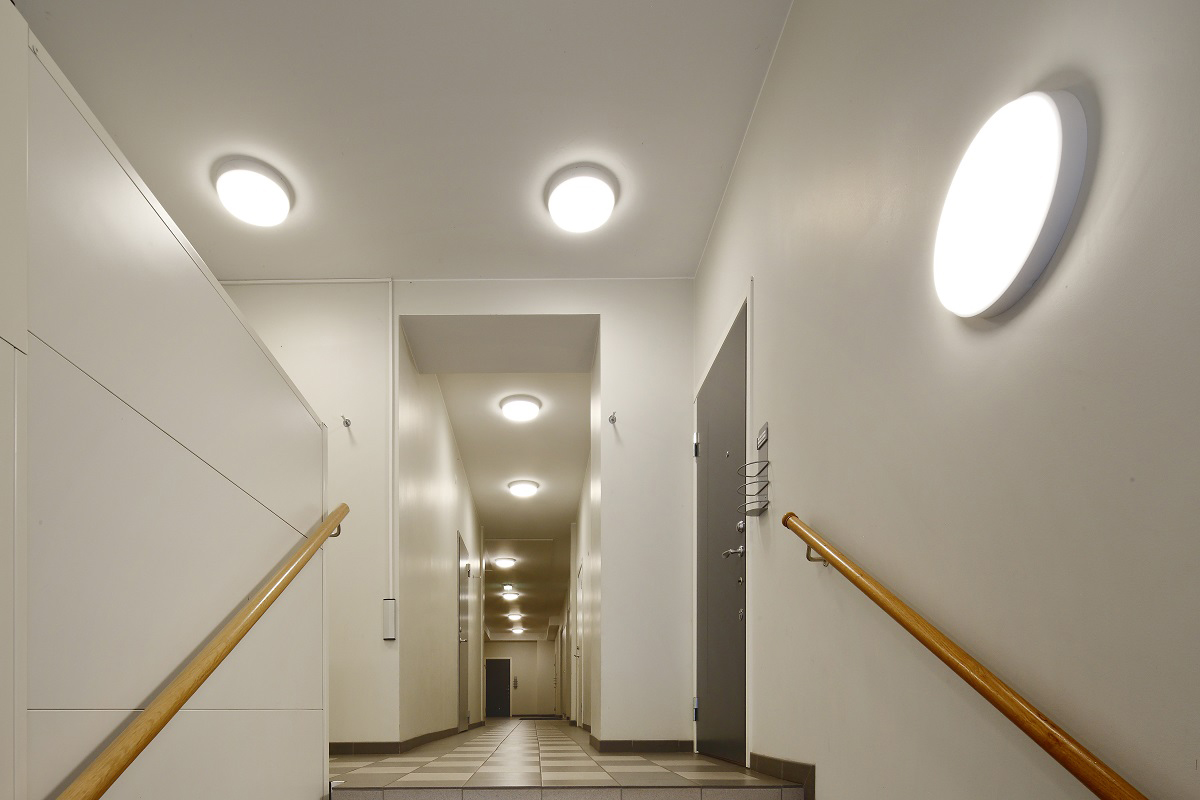 Plafond IP44 för inomhusbruk. Stomme av vitlackerad stålplåt. Kupa av opal akryl med vridfastsättning. LED-plattan är utbytbar. Monteras dikt tak eller på vägg. 2st kabelinföringar Ø 20 mm på baksidan. Förberedd för utanpåliggande kabel, 2st knock-out Ø 13 mm. Insticksplint 4x2x2,5 mm². Möjlighet till dos-montage. Tänd/släckfunktion via inbyggd mikrovågssensor med rörelse- och dagsljusavkänning. Armaturen kan styra upp till 10 st armaturer, dock max 300W, dubbelriktad. Kan parallellkopplas. Möjlighet att justera detekteringsområde, efterlystid samt dagsljuströskel. Inkopplingstid kan ställas mellan 5 sekunder och 15 minuter. Via dagsljuströskeln kan man justera när armaturen ska tända i förhållande till infallande dagsljus, armaturen tänder då på 100%. Sensorn lämpar sig bäst för takhöjd upp till 6 m. Armatur med mikrovågssensor bör ej placeras vid eller i anslutning till där material är i rörelse, eller där sensorn utsätts för vibrationer, mikrovågssensor detekterar även igenom t.ex väggar och dörrar.
