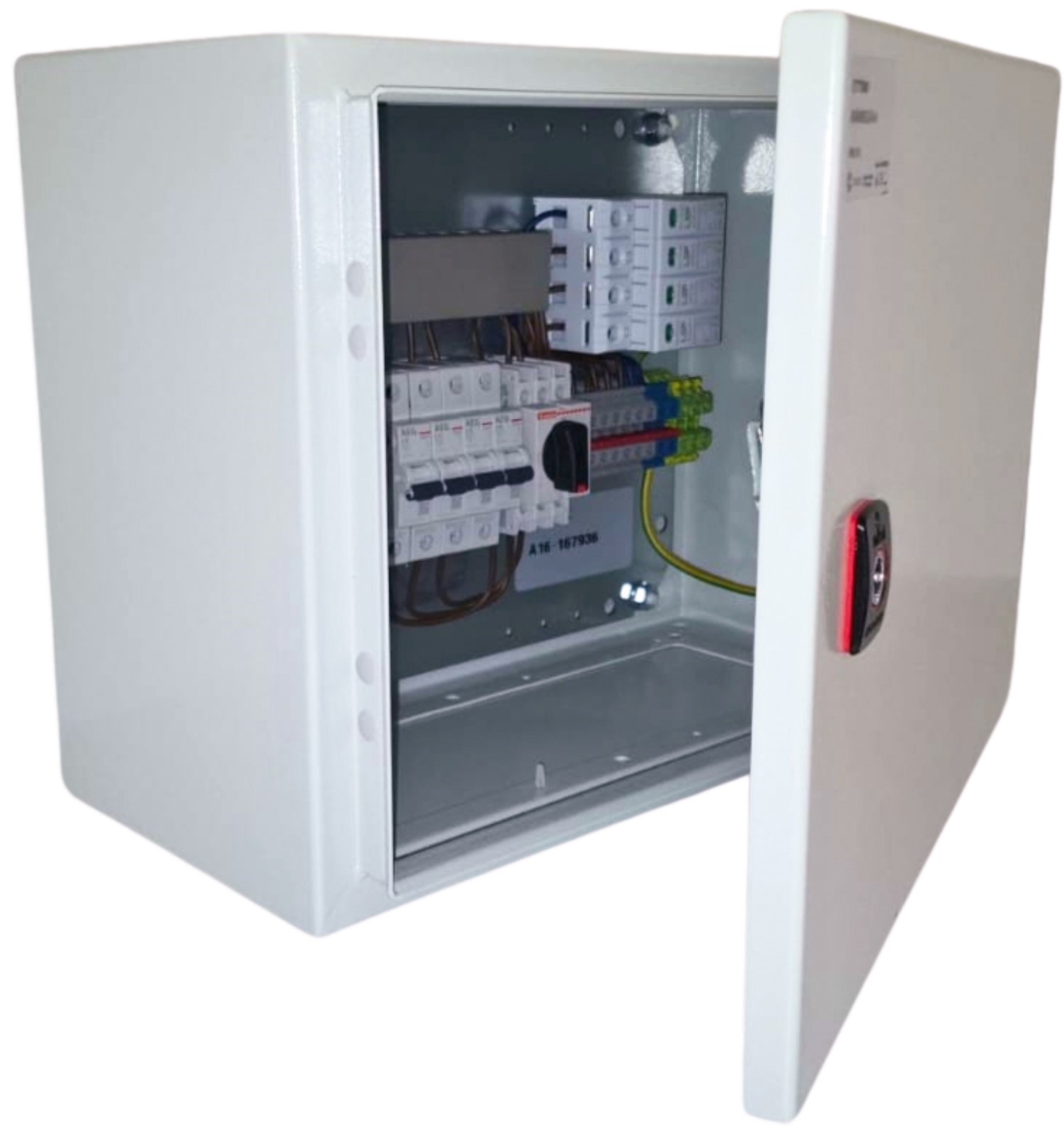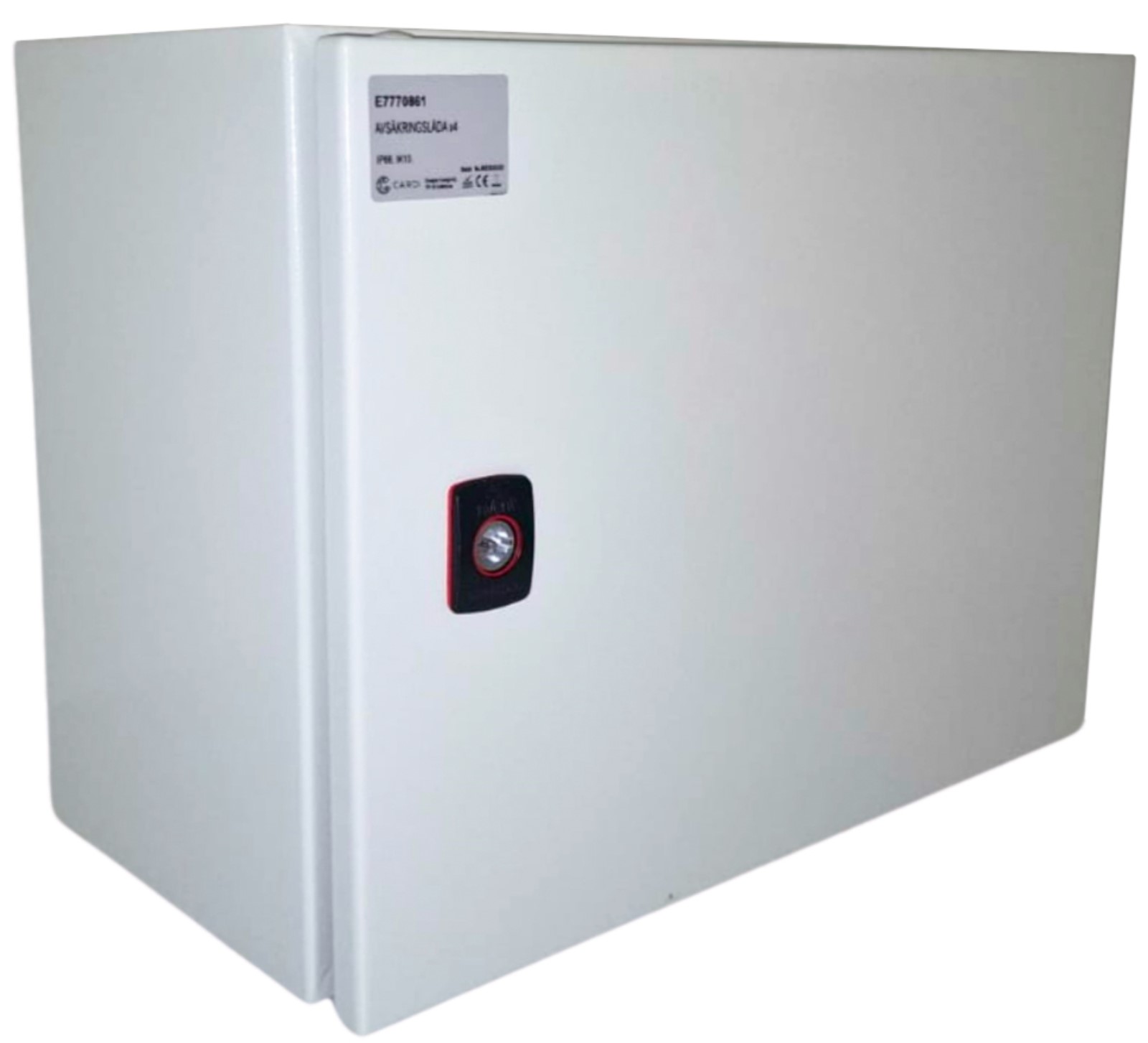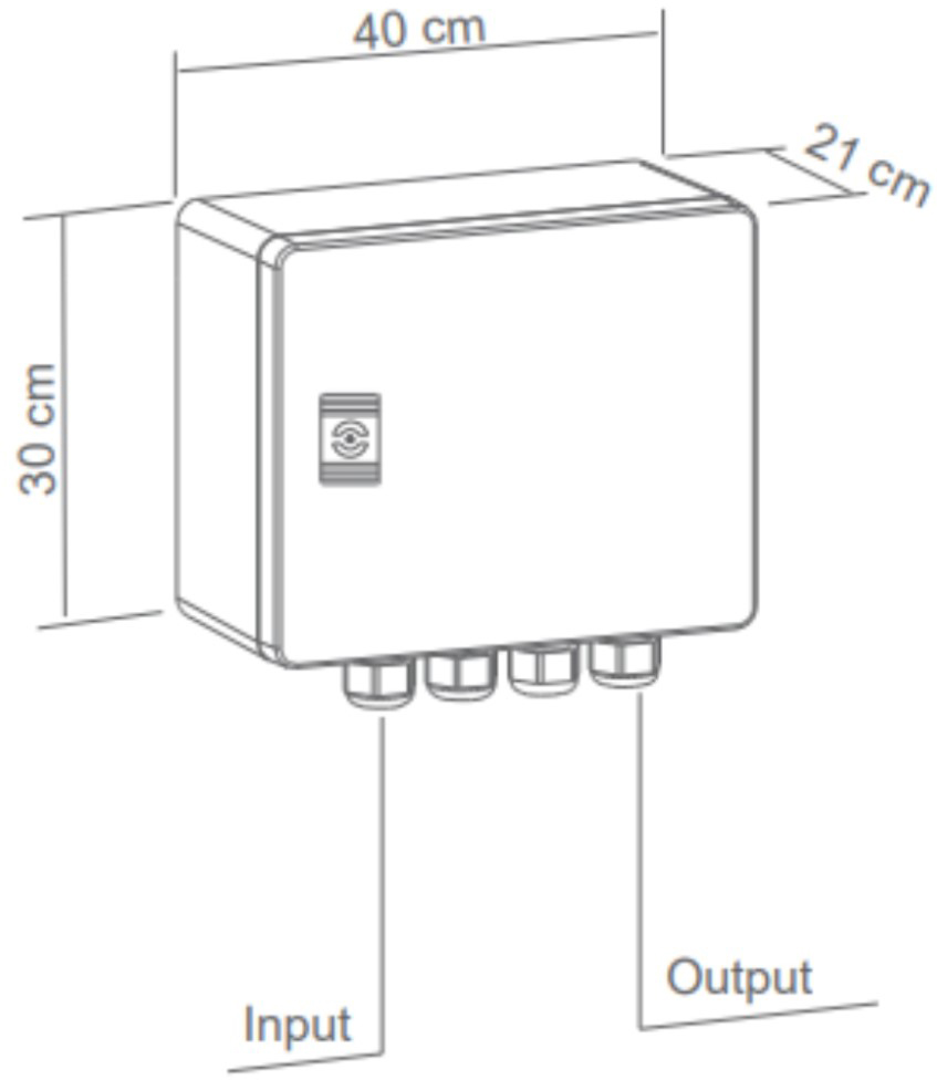 Säkringsskåp IP66, IK10 med förmonterad huvudbrytare 16A, 4 st 1-pol minibrytare C16 och överspänningsskydd på max urladdningsström 20kA med indikering. Övergångsfläns AFA02R5 ingår. Kabelfläns FL21 ingår ej, beställs separat.