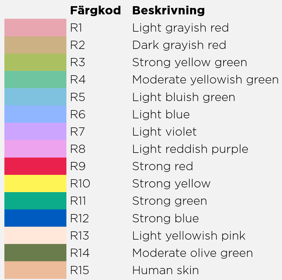 Traditionellt har CRI beräknats med hjälp av åtta standardfärger (R1–R8), men för mer avancerad bedömning används alla 15 färger (R1–R15). Dessa färger representerar olika nyanser och materialtyper.