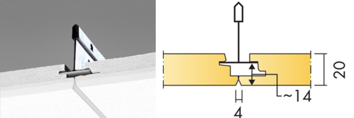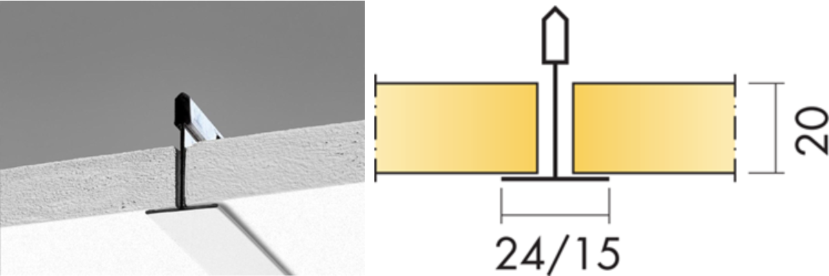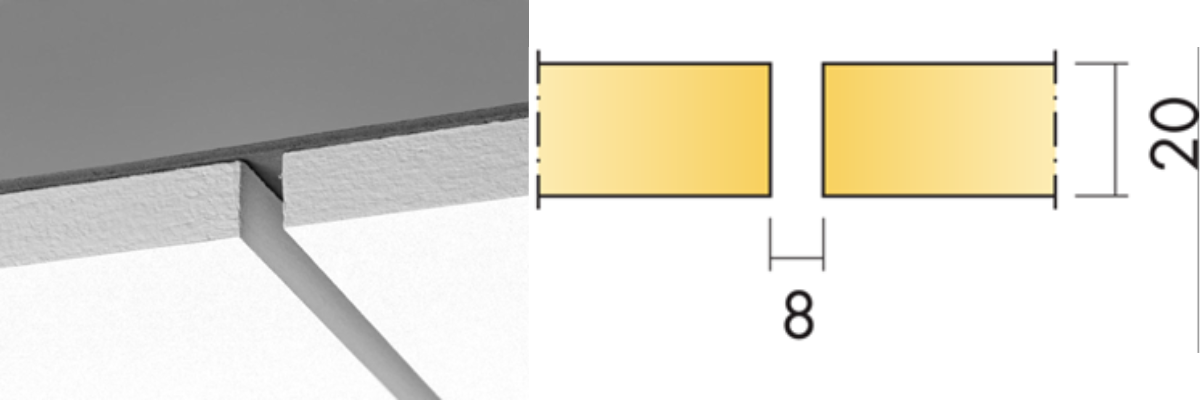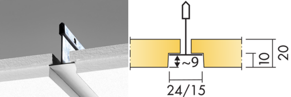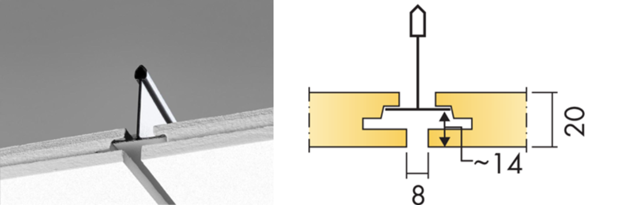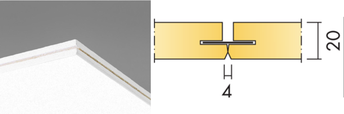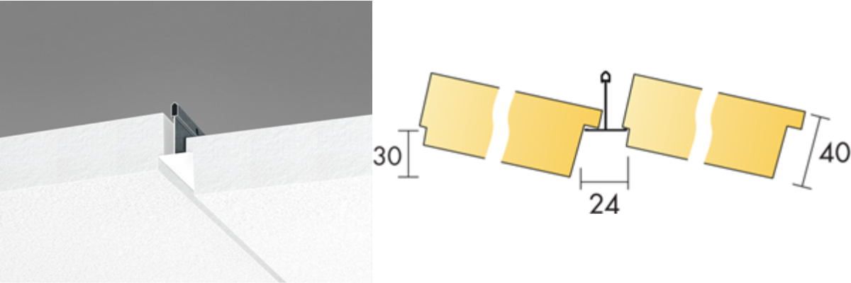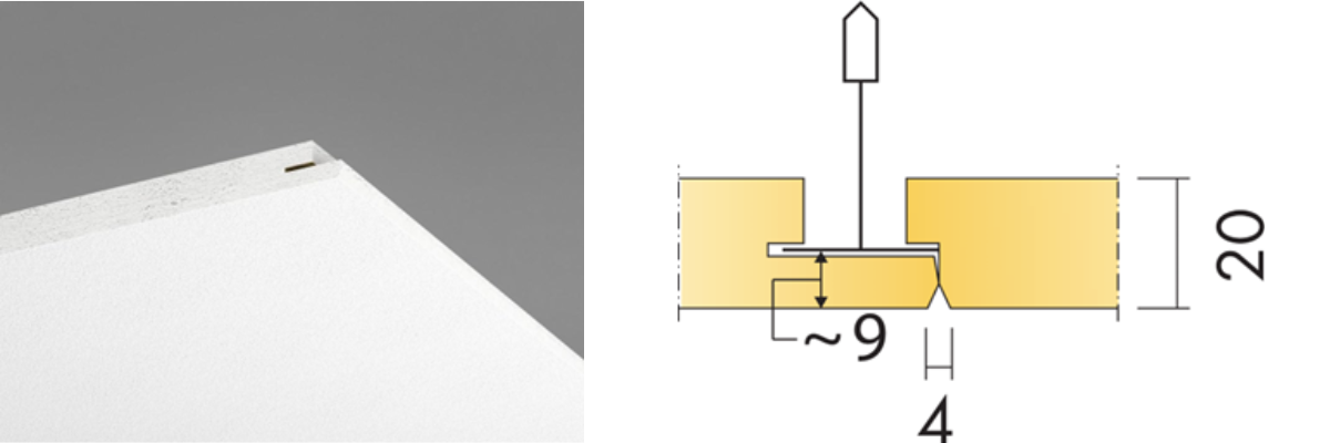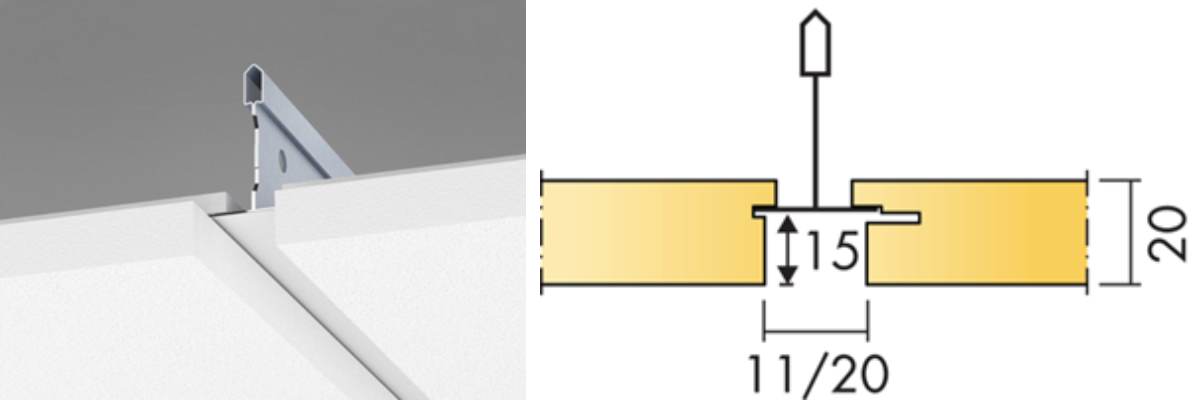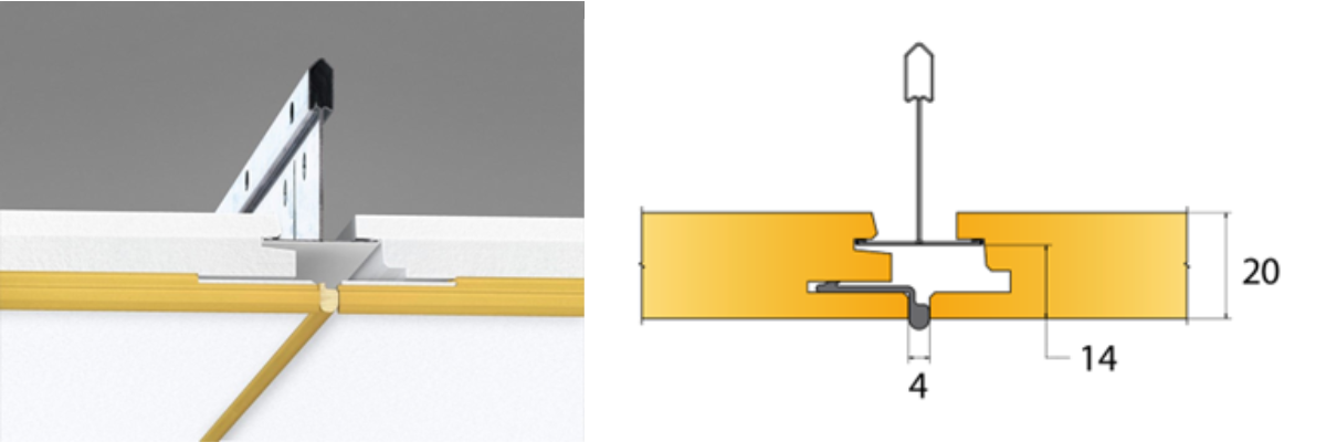 Dolt bärverk, lätt att demontera. Akustikskivan är förskjuten i förhållande till T-profilen vilket gör den svårt att ersätta med en Plato. En snygg och smidig lösning är att använda Cylli infälld som monteras i akustikskivan med avlastningsskiva E7910454.